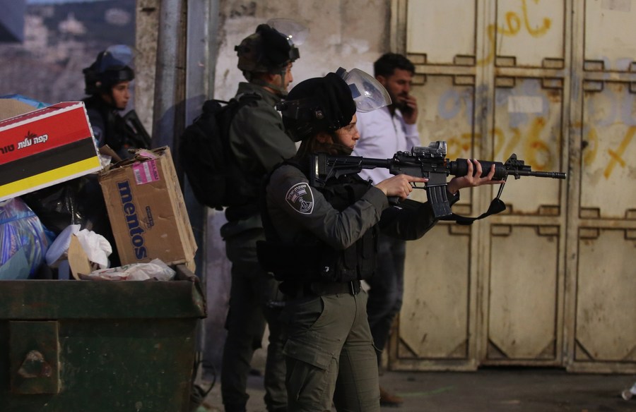 Members of Israeli border police are seen near the scene where a Palestinian man was killed in the town of Huwara, south of the West Bank city of Nablus, on Dec. 2, 2022. (Photo by Nidal Eshtayeh/Xinhua)