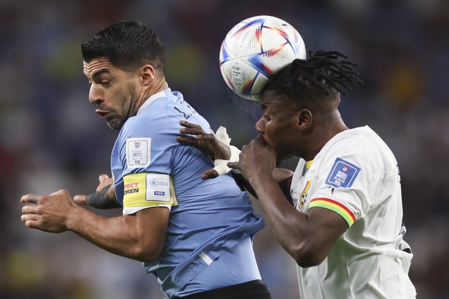 Luis Suarez (L) of Uruguay and Mohammed Salisu of Ghana in action during their Group H match at the 2022 FIFA World Cup at Al Janoub Stadium in Al Wakrah, Qatar on Dec. 2, 2022. (Xinhua/Pan Yulong)