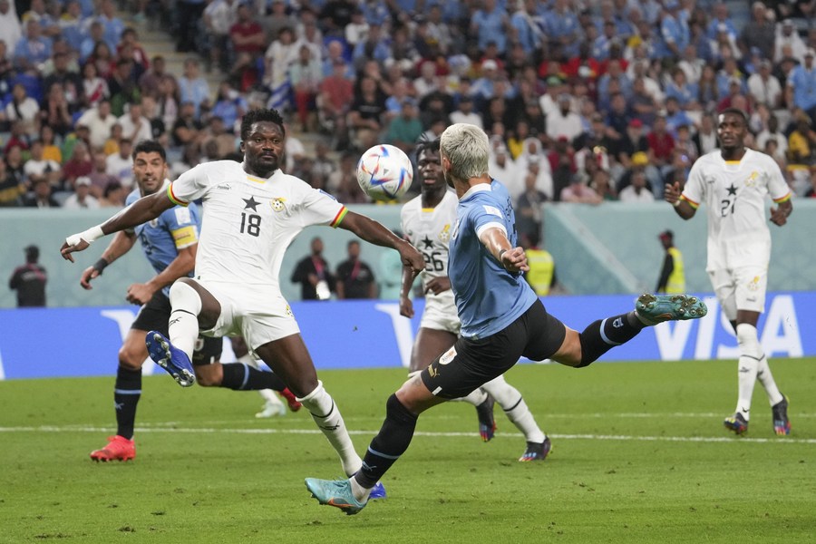 Giorgian de Arrascaeta (2nd R) of Uruguay shoots during the Group H match against Ghana at the 2022 FIFA World Cup at Al Janoub Stadium in Al Wakrah, Qatar on Dec. 2, 2022. (Xinhua/Li Gang)