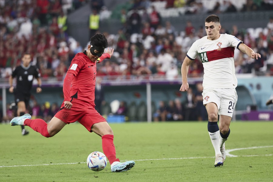 Son Heung-min (L) of South Korea shoots during the Group H match against Portugal at the 2022 FIFA World Cup at Education City Stadium in Al Rayyan, Qatar on Dec. 2, 2022. (Xinhua/Lan Hongguang)
