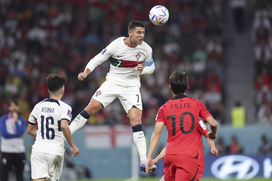 Cristiano Ronaldo (top) of Portugal heads for the ball during the Group H match against South Korea at the 2022 FIFA World Cup at Education City Stadium in Al Rayyan, Qatar on Dec. 2, 2022. (Xinhua/Li Ming)