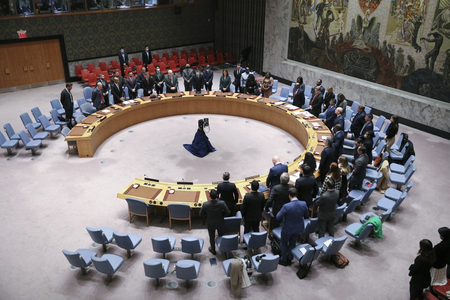 Members of the UN Security Council observe a minute of silence in memory of former Chinese President Jiang Zemin at the UN headquarters in New York, Nov. 30, 2022. (Xinhua/Xie E)