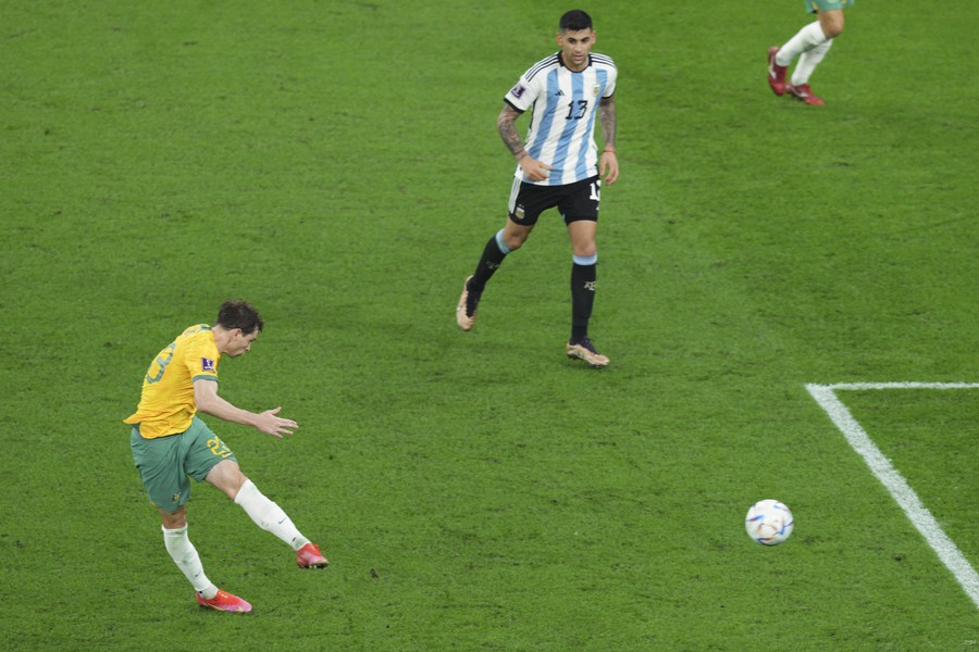 Craig Goodwin (L) scores for Australia during the Round of 16 match against Argentina at the 2022 FIFA World Cup at Ahmad Bin Ali Stadium in Al Rayyan, Qatar, Dec. 3, 2022. (Xinhua/Xin Yuewei)