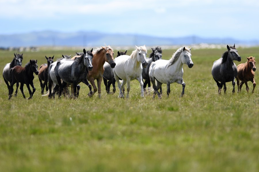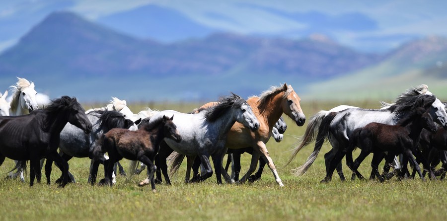 A herd of Hequ horses gallop on a ranch in Maqu County, Gannan Tibetan Autonomous Prefecture of northwest China's Gansu Province, July 15, 2021. (Xinhua/Chen Bin)