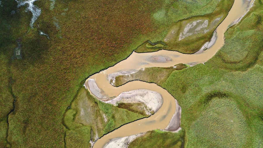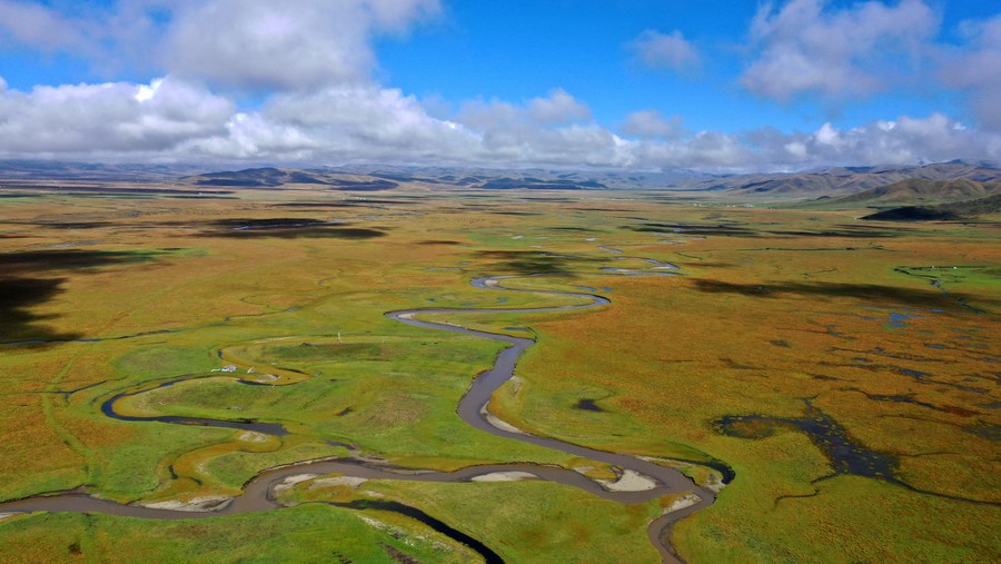 This aerial photo taken on Sept. 21, 2022 shows an autumn view of grasslands and Awancang Wetland in Maqu County, Gannan Tibetan Autonomous Prefecture of northwest China's Gansu Province. (Xinhua/Chen Bin)