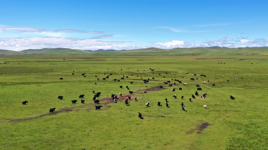 A herd of yak gallop and forage on a grassland in Maqu County, Gannan Tibetan Autonomous Prefecture of northwest China's Gansu Province, July 15, 2021. (Xinhua/Chen Bin)