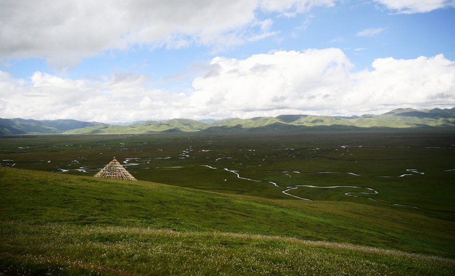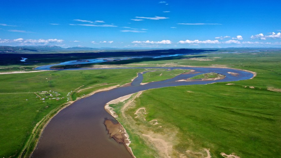 This aerial photo taken on July 13, 2021 shows the view of a restored grassland by the Yellow River in Maqu County, Gannan Tibetan Autonomous Prefecture of northwest China's Gansu Province. (Xinhua/Chen Bin)
