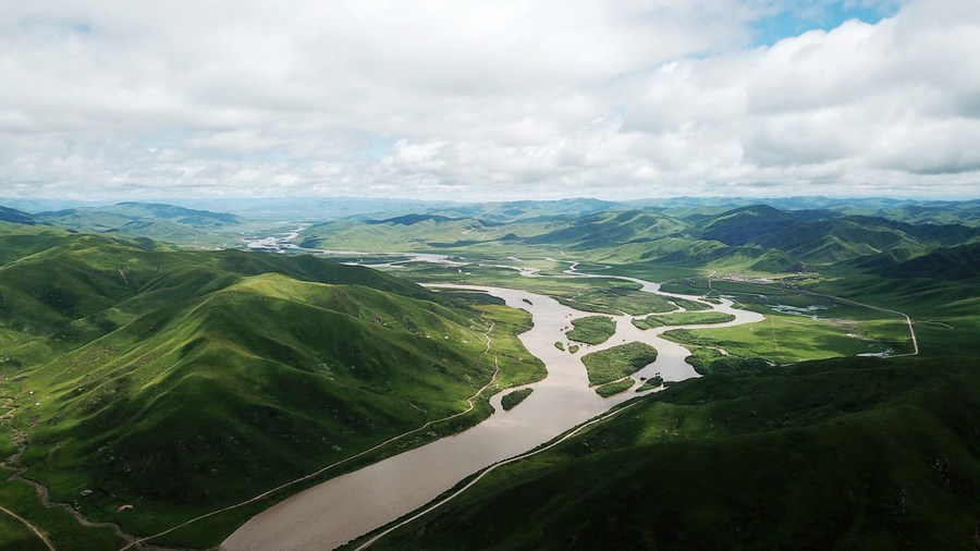 This aerial photo taken on June 23, 2019 shows a view of the Yellow River in Maqu County, Gannan Tibetan Autonomous Prefecture of northwest China's Gansu Province. (Xinhua/Chen Bin)