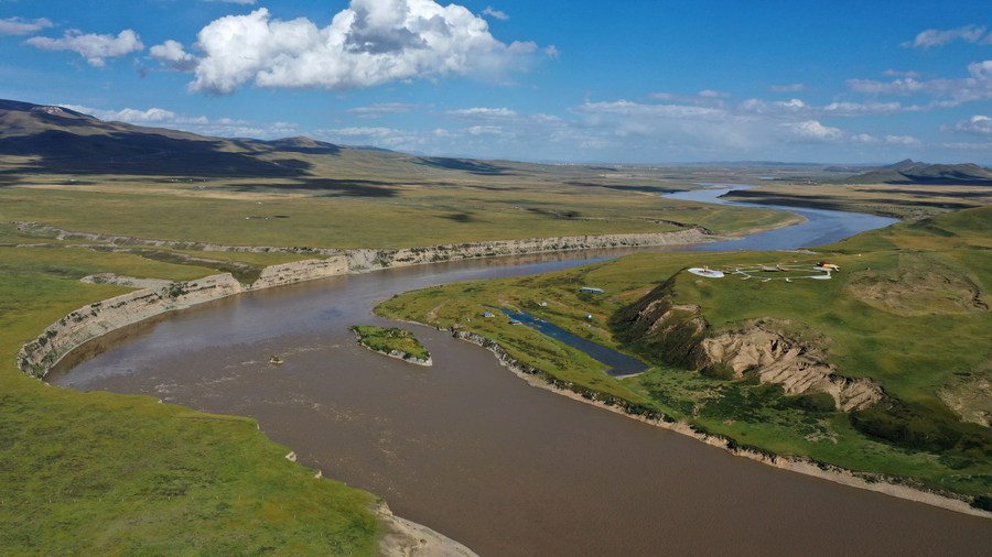 This aerial photo taken on Sept. 21, 2022 shows a view of the Yellow River in Maqu County, Gannan Tibetan Autonomous Prefecture of northwest China's Gansu Province. (Xinhua/Chen Bin)