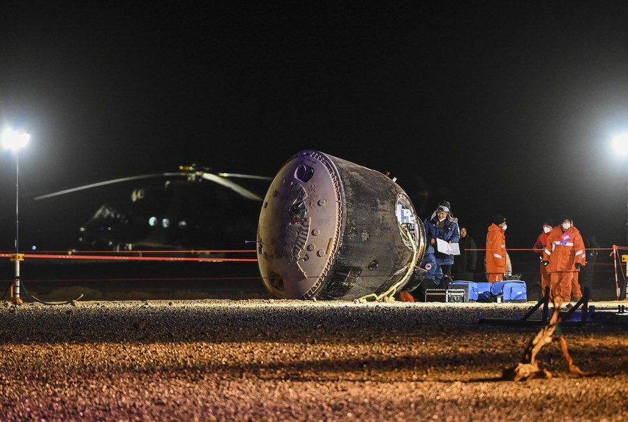 Shenzhou-14's return capsule, carrying astronauts Chen Dong, Liu Yang and Cai Xuzhe, touched down at the Dongfeng landing site in north China's Inner Mongolia Autonomous Region at 8:09 p.m. Beijing Time, according to the China Manned Space Agency.