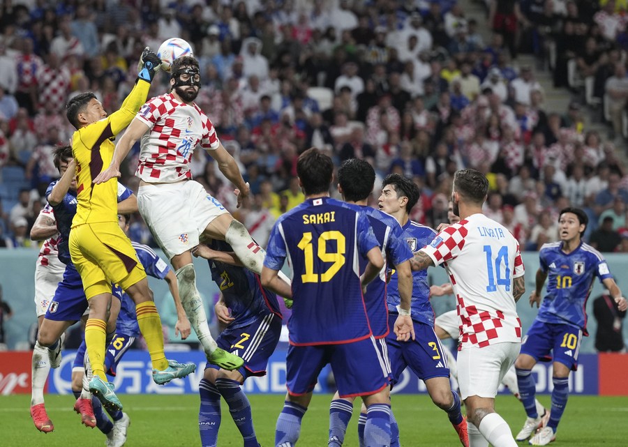 Japan's goalkeeper Gonda Shuichi (top L) vies with Josko Gvardiol of Croatia during the extra time of the Round of 16 match between Japan and Croatia at the 2022 FIFA World Cup at Al Janoub Stadium in Al Wakrah, Qatar, Dec. 5, 2022. (Xinhua/Zheng Huansong)