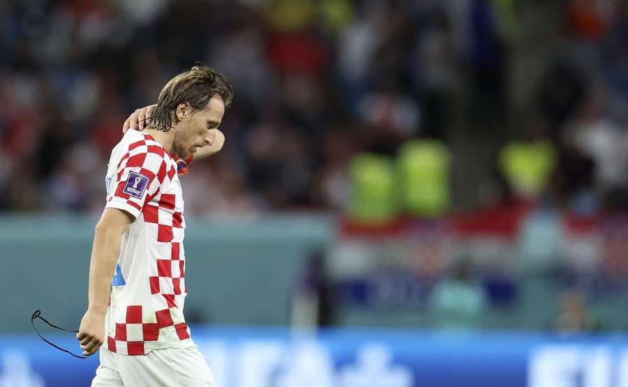 Luka Modric of Croatia walks out of the pitch after the first half of the Round of 16 match between Japan and Croatia at the 2022 FIFA World Cup at Al Janoub Stadium in Al Wakrah, Qatar, Dec. 5, 2022. (Xinhua/Li Ming)
