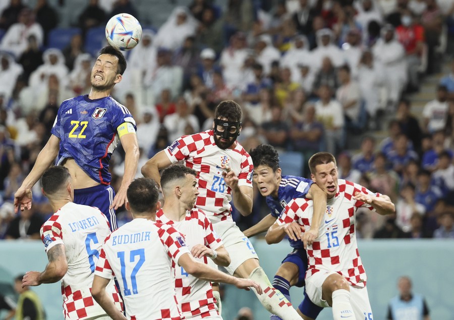Yoshida Maya (top) of Japan vies for a header during the Round of 16 match between Japan and Croatia at the 2022 FIFA World Cup at Al Janoub Stadium in Al Wakrah, Qatar, Dec. 5, 2022. (Xinhua/Lan Hongguang)
