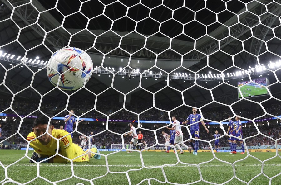 Japan's goalkeeper Gonda Shuichi fails to save a goal by Ivan Perisic of Croatia during the Round of 16 match between Japan and Croatia at the 2022 FIFA World Cup at Al Janoub Stadium in Al Wakrah, Qatar, Dec. 5, 2022. (Xinhua/Li Gang)