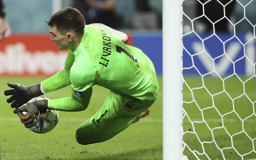 Dominik Livakovic, goalkeeper of Croatia, saves the penalty shot by Minamino Takumi of Japan during the penalty shootout of the Round of 16 match between Japan and Croatia at the 2022 FIFA World Cup at Al Janoub Stadium in Al Wakrah, Qatar, Dec. 5, 2022. (Xinhua/Lan Hongguang)