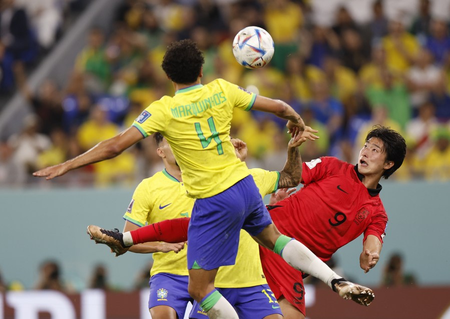 Cho Gue-sung (R) of South Korea vies with Marquinhos of Brazil during their Round of 16 match at the 2022 FIFA World Cup at Stadium 974 in Doha, Qatar, Dec. 5, 2022. (Xinhua/Wang Lili)