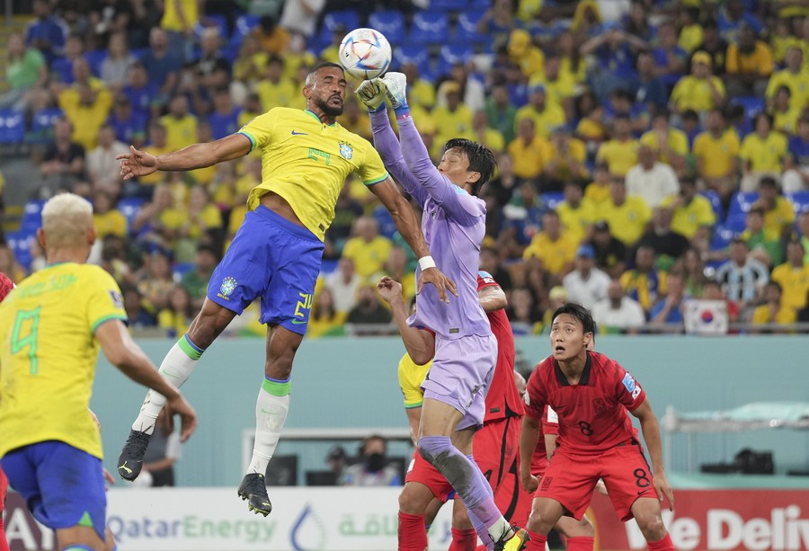 Kim Seung-gyu (top R), goalkeeper of South Korea, vies with Bremer of Brazil during their Round of 16 match at the 2022 FIFA World Cup at Ras Abu Aboud (974) Stadium in Doha, Qatar, Dec. 5, 2022. (Xinhua/Chen Cheng)■