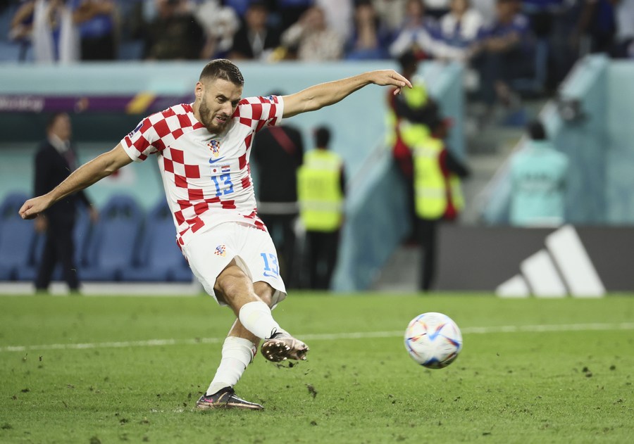 Nikola Vlasic of Croatia shoots and scores the penalty shot during the penalty shootout of the Round of 16 match between Japan and Croatia at the 2022 FIFA World Cup at Al Janoub Stadium in Al Wakrah, Qatar, Dec. 5, 2022. (Xinhua/Lan Hongguang)