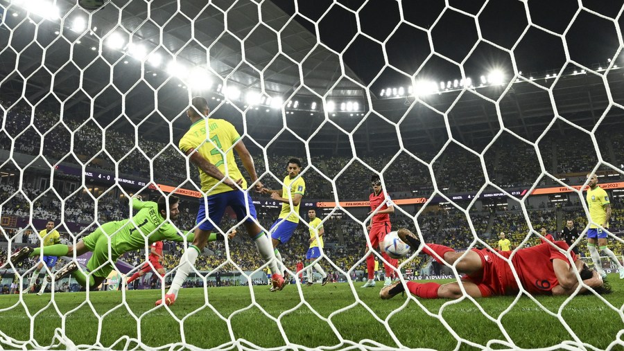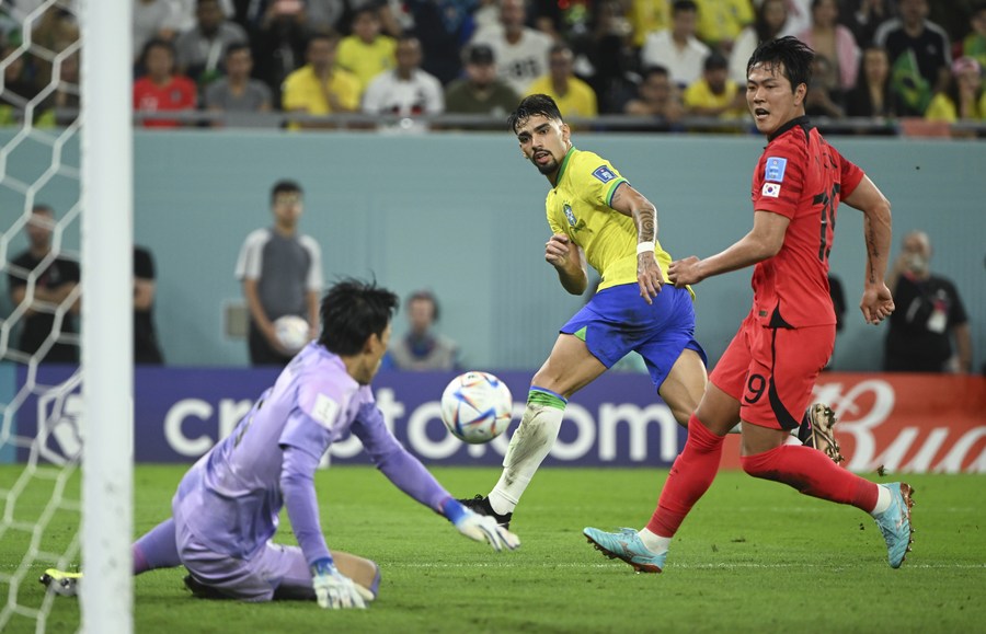 Lucas Paqueta (C) of Brazil shoots during the Round of 16 match between Brazil and South Korea at the 2022 FIFA World Cup at Stadium 974 in Doha, Qatar, Dec. 5, 2022. (Xinhua/Li Ga)