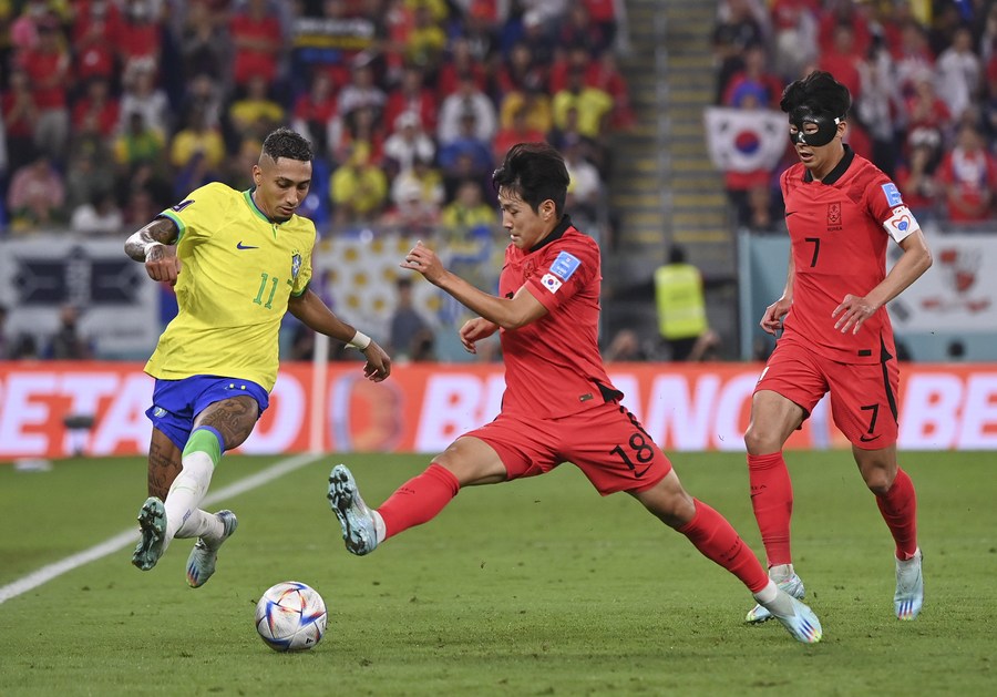 Raphinha (L) of Brazil vies with Lee Kang-in (C) of South Korea during their Round of 16 match at the 2022 FIFA World Cup at Stadium 974 in Doha, Qatar, Dec. 5, 2022. (Xinhua/Chen Cheng)