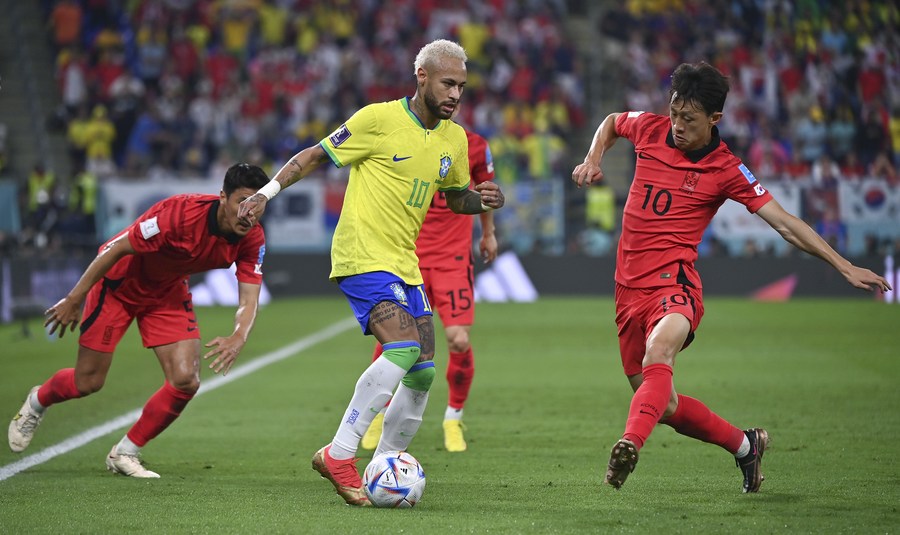 Neymar (C) of Brazil controls the ball during the Round of 16 match between Brazil and South Korea at the 2022 FIFA World Cup at Stadium 974 in Doha, Qatar, Dec. 5, 2022. (Xinhua/Chen Cheng)
