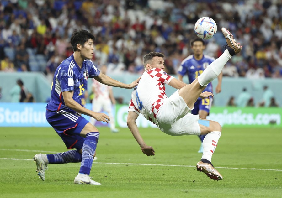 Ivan Perisic (R) of Croatia vies for the ball during the Round of 16 match between Japan and Croatia at the 2022 FIFA World Cup at Al Janoub Stadium in Al Wakrah, Qatar, Dec. 5, 2022. (Xinhua/Li Ming)