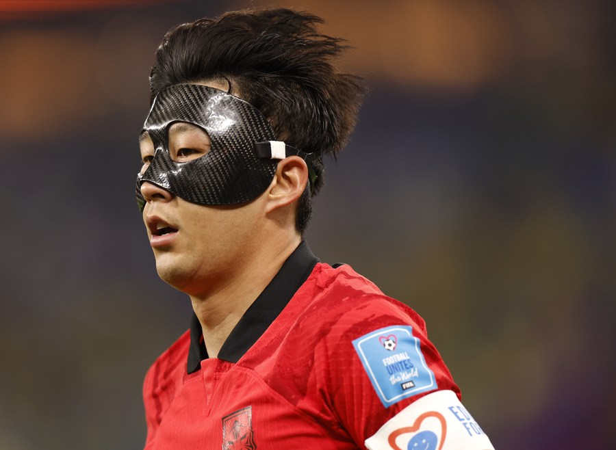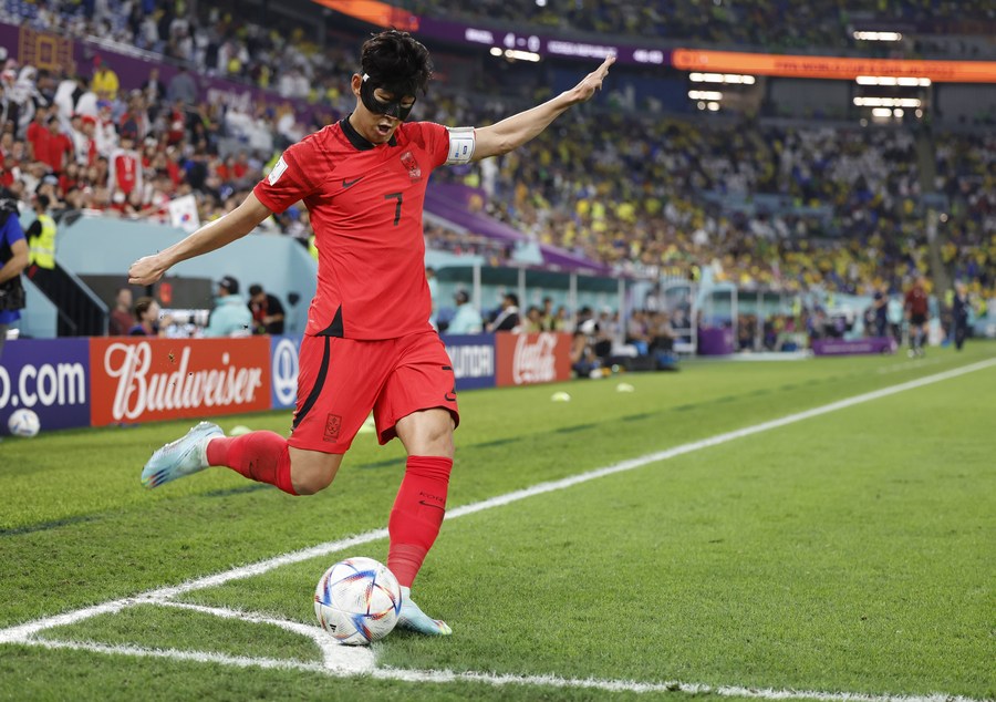 Son Heung-min of South Korea competes during the Round of 16 match between Brazil and South Korea at the 2022 FIFA World Cup at Stadium 974 in Doha, Qatar, Dec. 5, 2022. (Xinhua/Wang Lili)