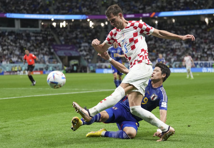 Borna Barisic (top) of Croatia vies with Mitoma Kaoru of Japan during the extra time of the Round of 16 match between Japan and Croatia at the 2022 FIFA World Cup at Al Janoub Stadium in Al Wakrah, Qatar, Dec. 5, 2022. (Xinhua/Li Gang)