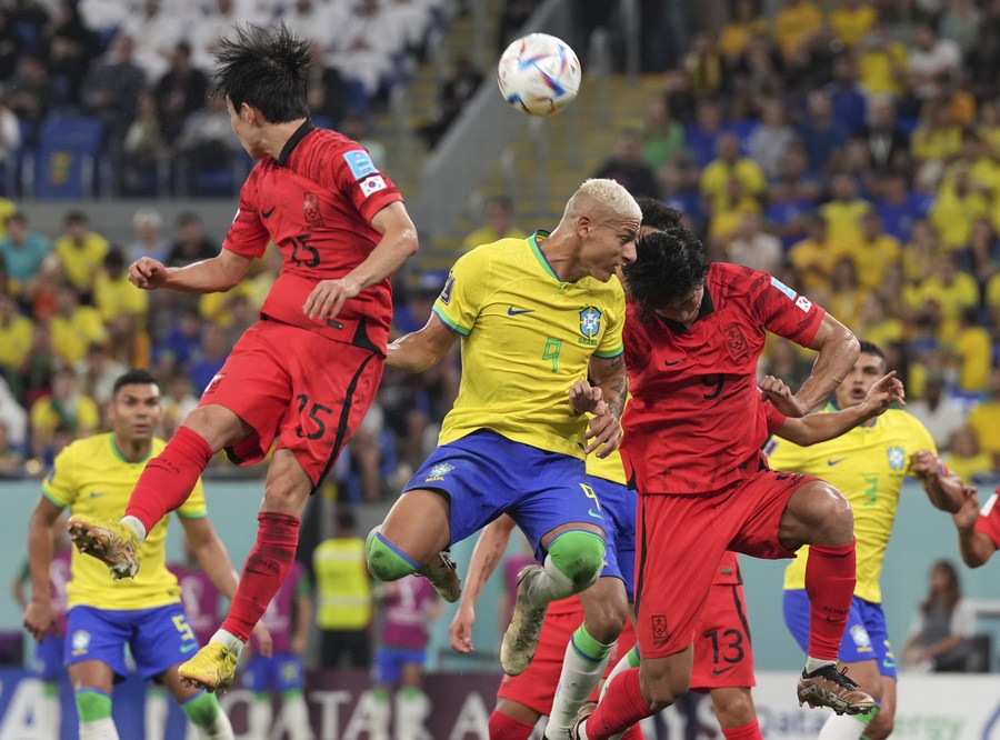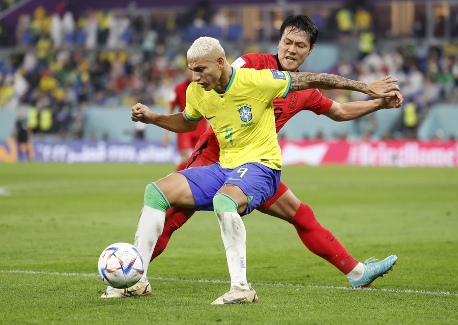 Richarlison (L) of Brazil vies with Kim Young-gwon of South Korea during their Round of 16 match at the 2022 FIFA World Cup at Ras Abu Aboud (974) Stadium in Doha, Qatar, Dec. 5, 2022. (Xinhua/Wang Lili)