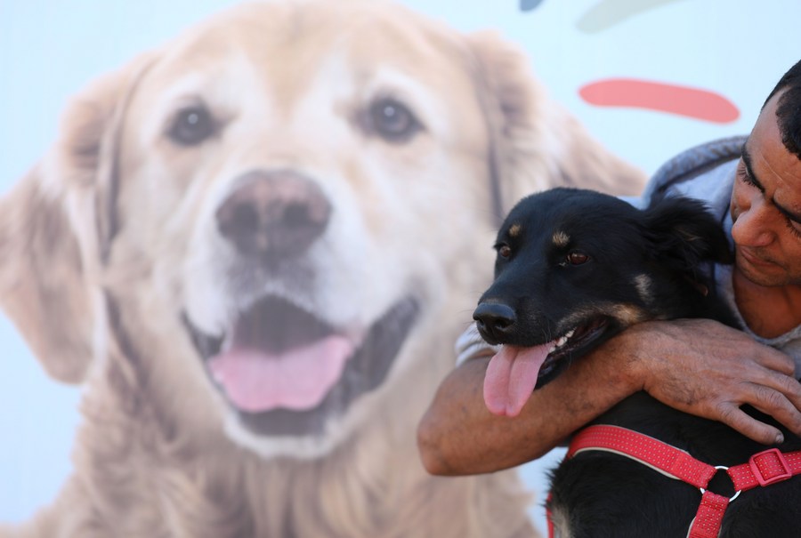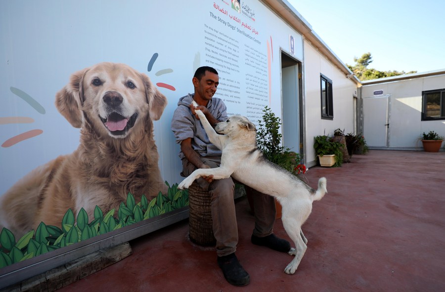 A Palestinian worker plays with a dog at a medical center for caring and sterilizing stray dogs in the West Bank city of Ramallah on Nov. 19, 2022.(Photo by Ayman Nobani/Xinhua)