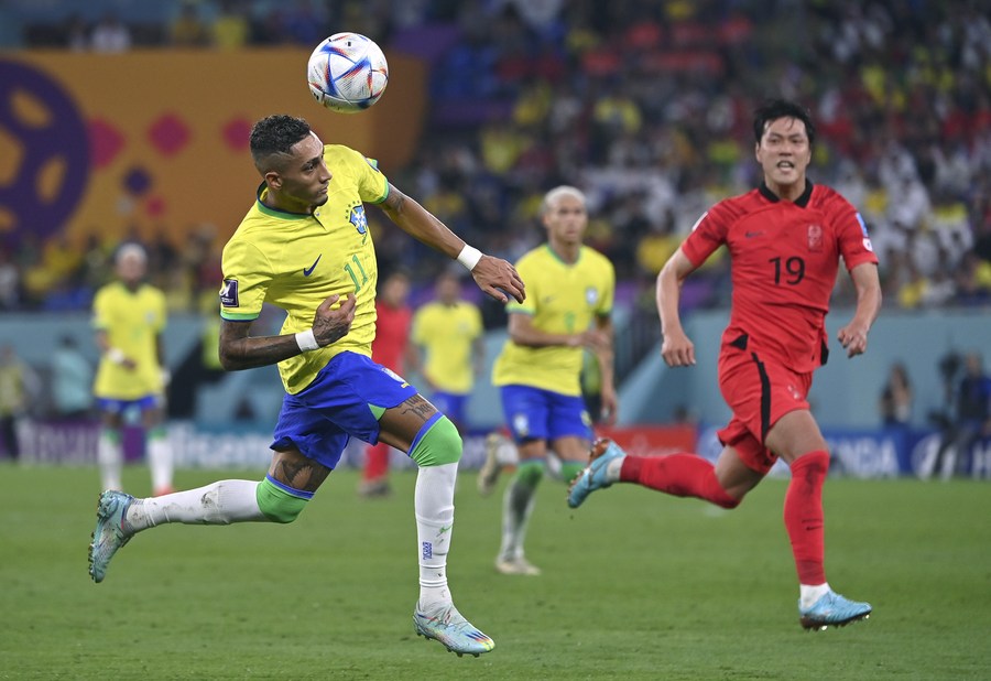 Raphinha (L) of Brazil vies for the ball during the Round of 16 match between Brazil and South Korea at the 2022 FIFA World Cup at Stadium 974 in Doha, Qatar, Dec. 5, 2022. (Xinhua/Chen Cheng)