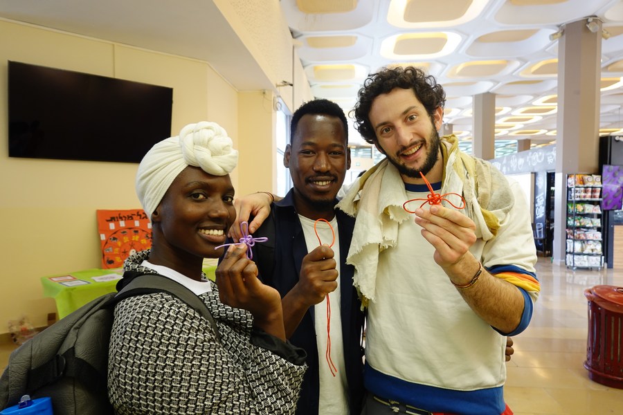 Students show the Chinese knots tied by themselves during the "Confucius Day" Chinese cultural festival at the Hebrew University of Jerusalem, on Dec. 5, 2022. (Xinhua/Wang Zhuolun)