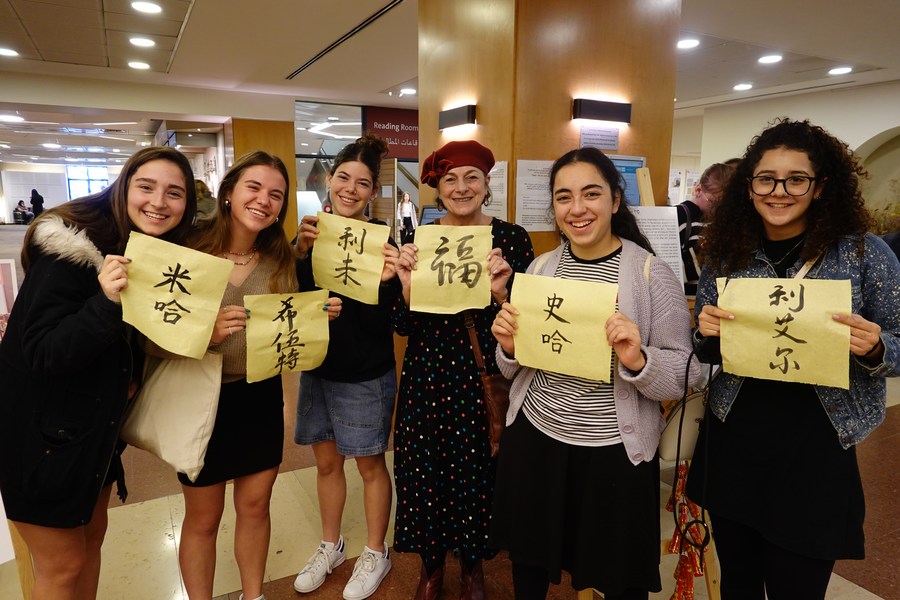 Photo taken shows students holding Chinese calligraphy papers during the "Confucius Day" Chinese cultural festival at the Hebrew University of Jerusalem, on Dec. 5, 2022. (Xinhua/Wang Zhuolun)