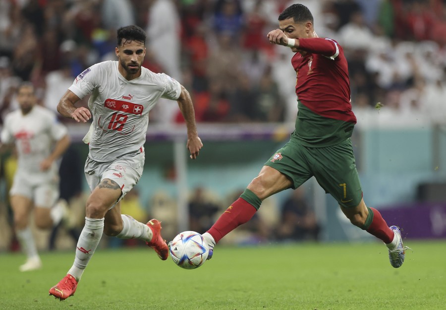 Eray Coemert (L) of Switzerland vies with Cristiano Ronaldo of Portugal during the Round of 16 match between Portugal and Switzerland of the 2022 FIFA World Cup at Lusail Stadium in Lusail, Qatar, Dec. 6, 2022. (Xinhua/Han Yan)