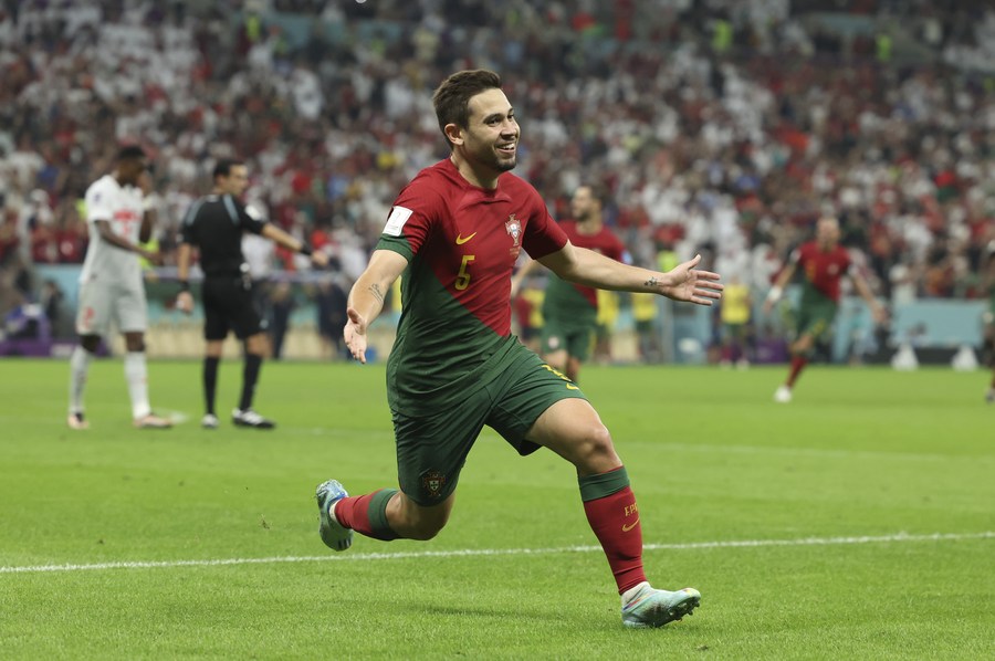 Raphael Guerreiro of Portugal celebrates his goal during the Round of 16 match between Portugal and Switzerland of the 2022 FIFA World Cup at Lusail Stadium in Lusail, Qatar, Dec. 6, 2022. (Xinhua/Han Yan)