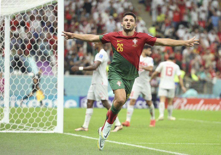 LUSAIL, Qatar, Dec. 6 (Xinhua) -- Goncalo Ramos scored the first hat-trick of the 2022 FIFA World Cup in Qatar as Portugal reached the quarterfinals with an emphatic 6-1 victory over Switzerland here on Tuesday.