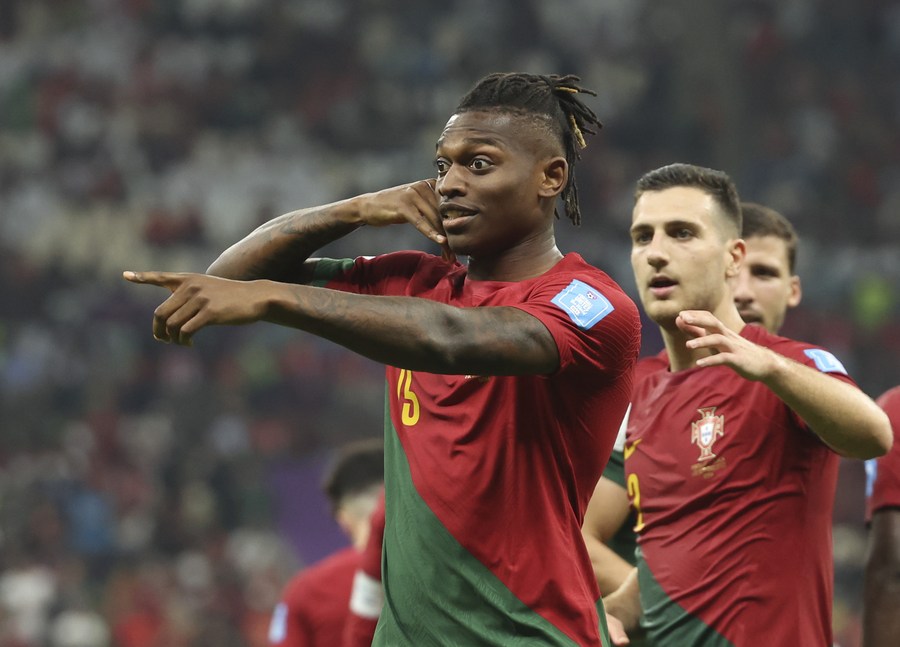 Rafael Leao (L) of Portugal celebrates his goal during the Round of 16 match between Portugal and Switzerland of the 2022 FIFA World Cup at Lusail Stadium in Lusail, Qatar, Dec. 6, 2022. (Xinhua/Han Yan)