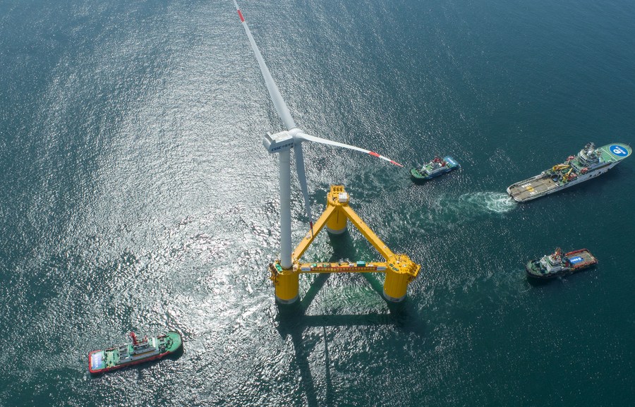 Aerial photo taken on May 29, 2022 shows a deep-sea floating wind power equipment "Fuyao" being towed from Maoming to Luodousha sea area, south China's Guangdong Province. (Xinhua/Liu Dawei)