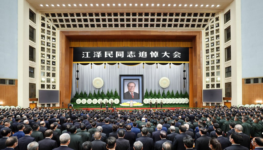 BEIJING, Dec. 6 (Xinhua) -- A memorial meeting for Jiang Zemin, who passed away on Nov. 30 at the age of 96, was held Tuesday morning in the Great Hall of the People in Beijing.