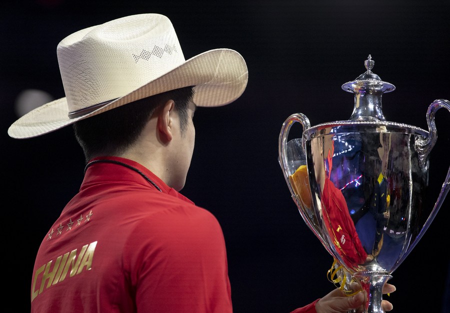 Fan Zhendong of China attends the awarding ceremony after the men's singles final against Truls Moregard of Sweden at 2021 World Table Tennis Championships Finals in Houston, the United States on Nov. 29, 2021. (Photo by Nick Wagner/Xinhua)