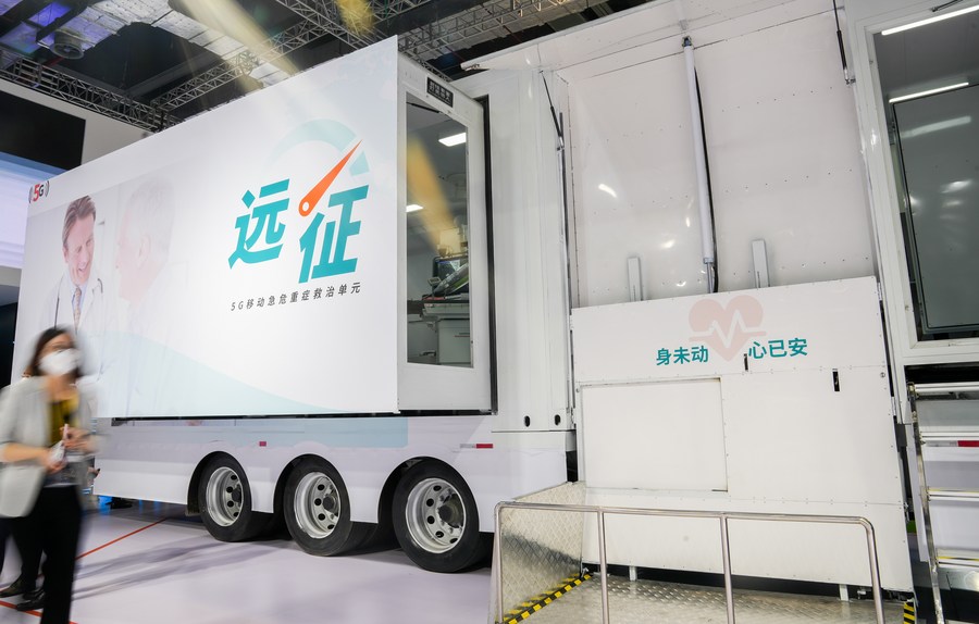 This photo taken on Nov. 6, 2022 shows the "Expedition" 5G mobile emergency and critical interventional treatment unit exhibited at the Siemens Healthineers booth in the medical equipment and healthcare products exhibition area of the fifth China International Import Expo (CIIE) at the National Exhibition and Convention Center (Shanghai) in east China's Shanghai. (Xinhua/Ding Ting)