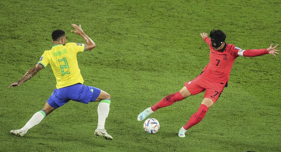 Son Heung-min (R) of South Korea vies with Danilo of Brazil during their Round of 16 match at the 2022 FIFA World Cup at Stadium 974 in Doha, Qatar, Dec. 5, 2022. (Xinhua/Pan Yulong)