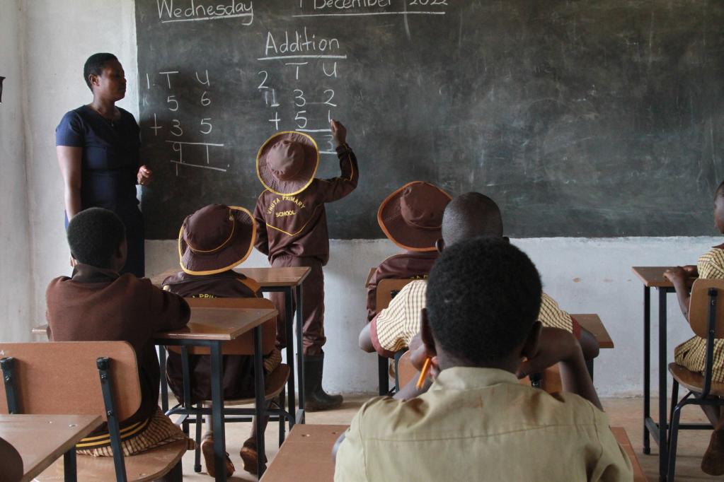 A teacher teaches mathematics at Vhuta Primary School in Goromonzi District, Zimbabwe, Dec. 7, 2022. (Photo by Tafara Mugwara/Xinhua)