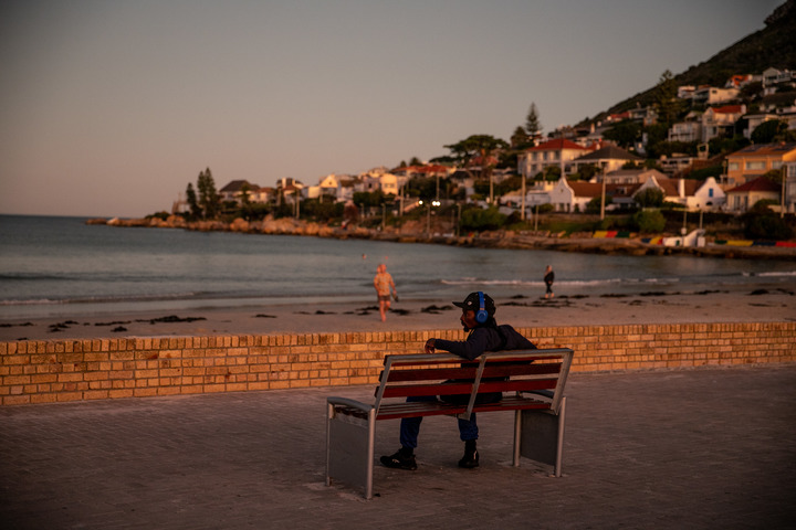 A man sits on a bench at Fish Hoek Beach after sunset during a power cut in Cape Town, South Africa, on June 29, 2022. (Xinhua/Lyu Tianran)
