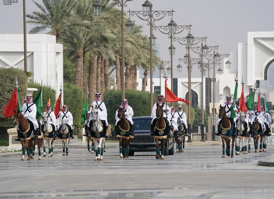 Xi's car, under the escort of guards riding motorcycles and horses, arrived at the Al Yamamah Palace where the Saudi crown prince warmly greeted the Chinese president.