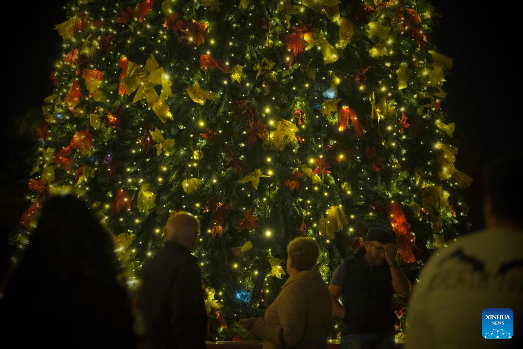 People stand in front of a Christmas tree in Valletta, Malta, on Dec. 8, 2022. (Photo by Jonathan Borg/Xinhua)