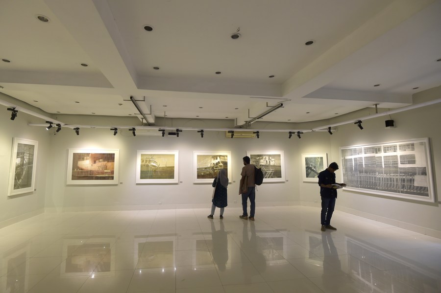 Visitors view an art exhibition showcasing magnificent woodcuts on paper, the earliest form of Chinese printing which uses blocks cut from wood, in Dhaka, Bangladesh on Dec. 5, 2022. (Xinhua)