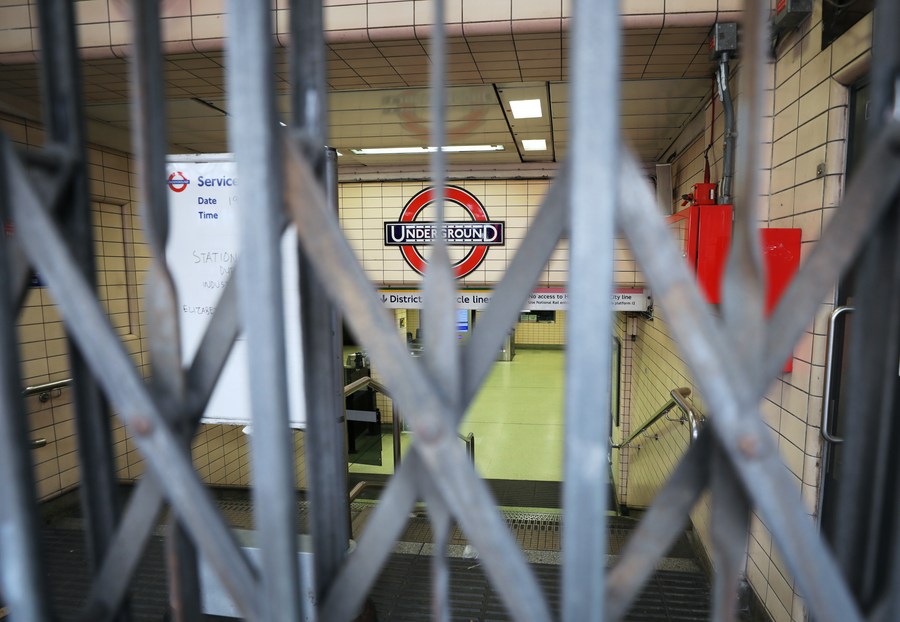 Photo taken on Aug. 19, 2022 shows an entrance of Paddington tube station closed due to a strike in London, Britain. (Xinhua/Li Ying)