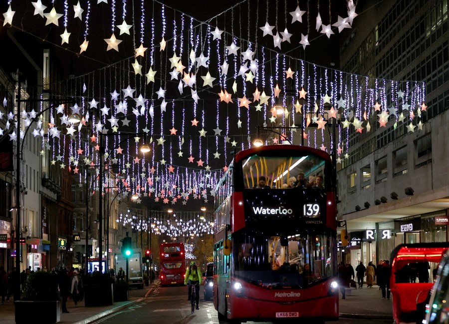 A double-decker bus runs on Oxford Street decorated with Christmas lights in central London, Britain, on Nov. 29, 2022. (Xinhua/Li Ying)