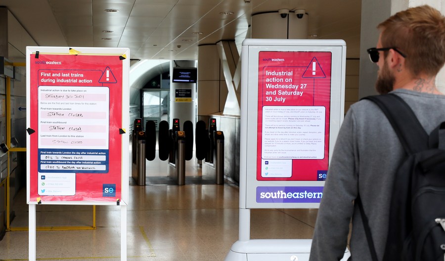 A passanger stands next to the gate of Waterloo East Station, which is closed due to strike, in London, Britain, July 30, 2022. (Xinhua/Li Ying)